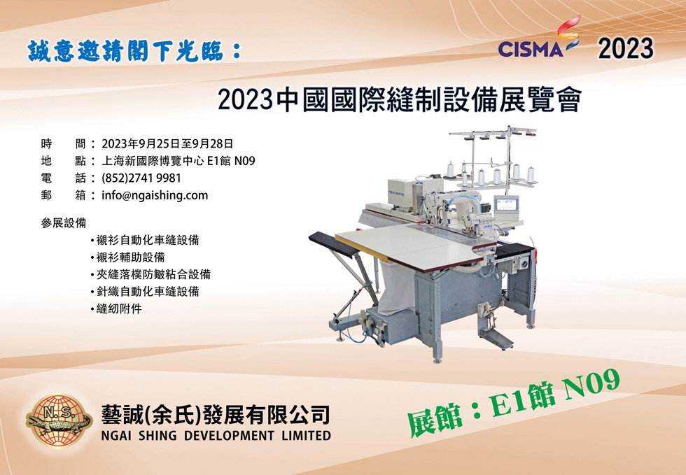 金秋九月,藝誠(余氏)發(fā)展有限公司將攜精心研發(fā)的各類服裝生產(chǎn)設(shè)備盛裝出席于2023年9月25日至28日在上海舉辦的 CISMA 2023展覽會。屆時歡迎各位新老客戶蒞臨指導。