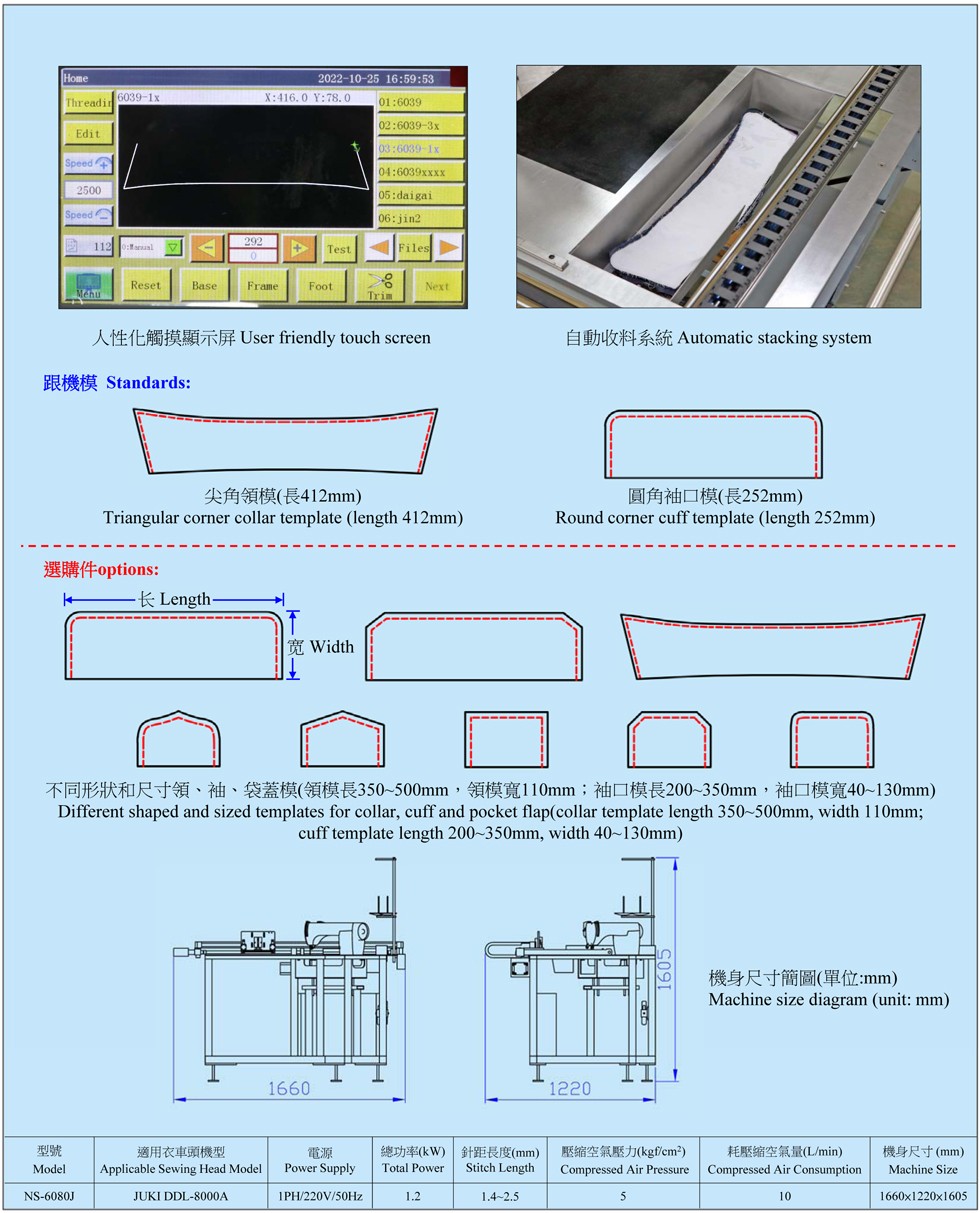 6. 車縫不同形狀和尺寸領(lǐng)、袖、袋蓋時(shí),需更換相應(yīng)模具