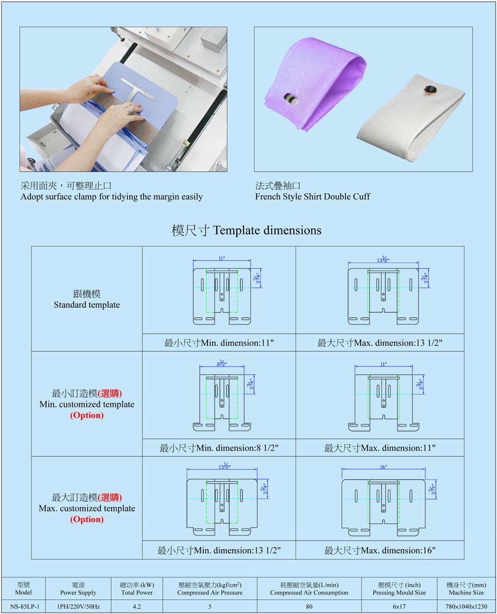 3. 上、下模均發(fā)熱,可成型及壓平袖口,跟機袖口模寬度11"~13 1/2"