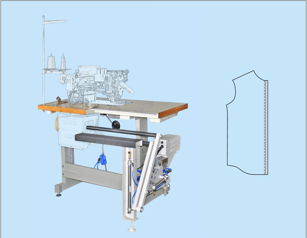 配合單針平車,車縫男女裝前幅鈕子,并將裁片整齊迭好,節(jié)省人手提高效率