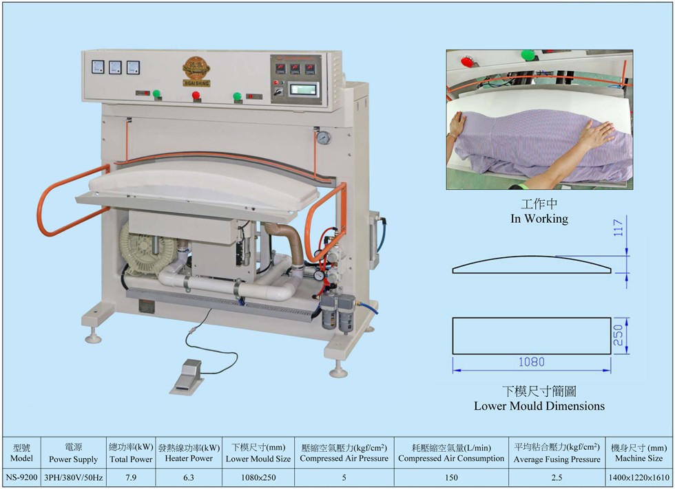 3. 采用氣液增壓缸垂直加壓,壓力大且平均,壓熨效果佳