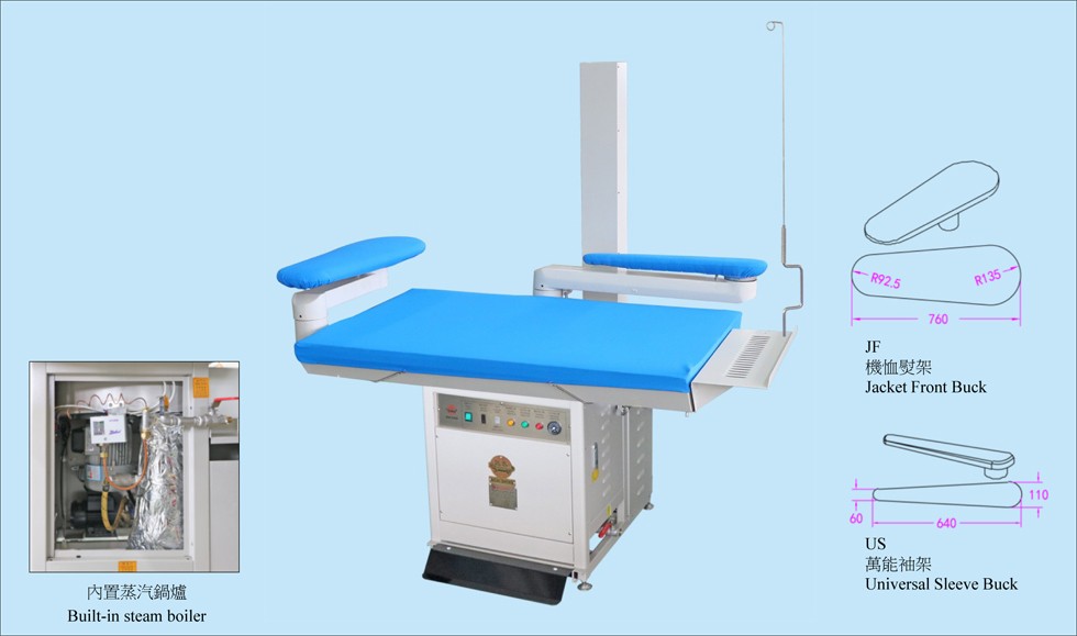3.備有雙熨架(JF+US),臺(tái)面與熨架間可自動(dòng)切換抽濕功能