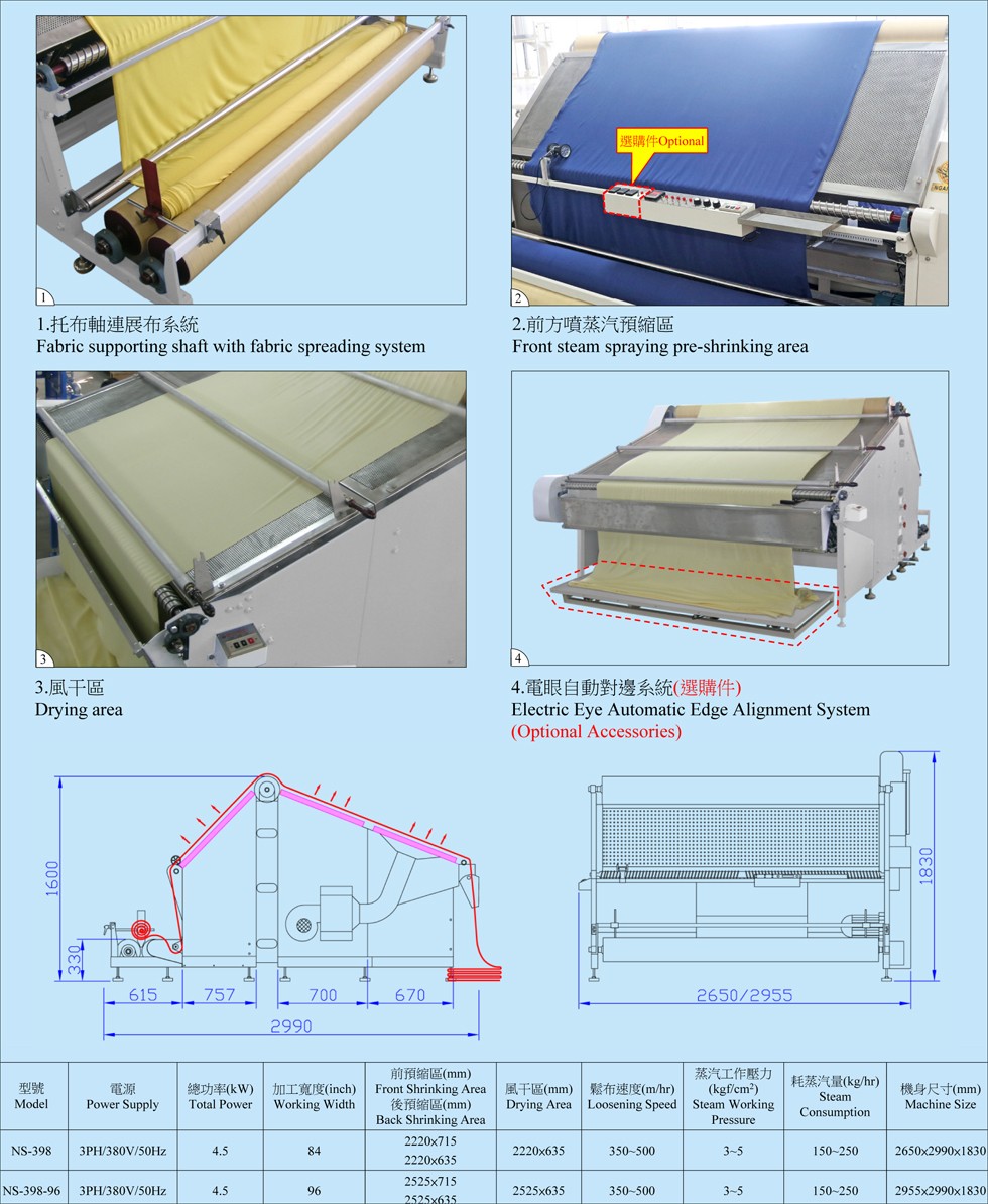 3. 采用前后噴蒸汽濕潤布料,結(jié)合高溫?zé)犸L(fēng)風(fēng)干系統(tǒng),使布料達(dá)到預(yù)縮效果,減少松布后停放時(shí)間(僅需2小時(shí),針織、梳織、牛仔布料種類繁多,不同種類的預(yù)縮效果及停放時(shí)間會有不同)