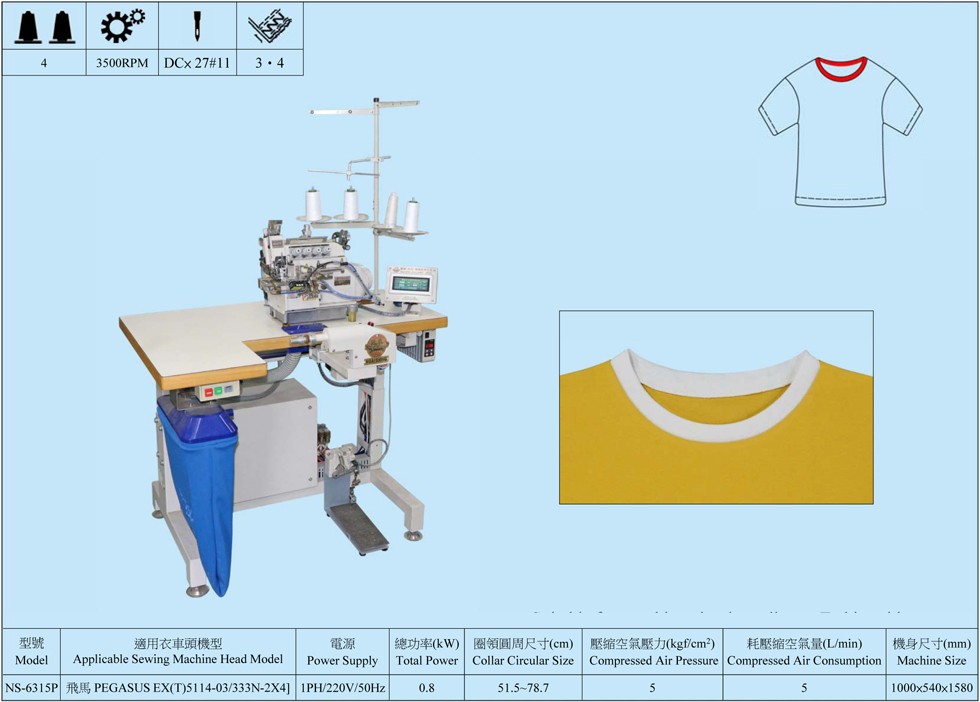 1. 本機(jī)可配合細(xì)咀級骨車,適用車縫T恤圓領(lǐng)