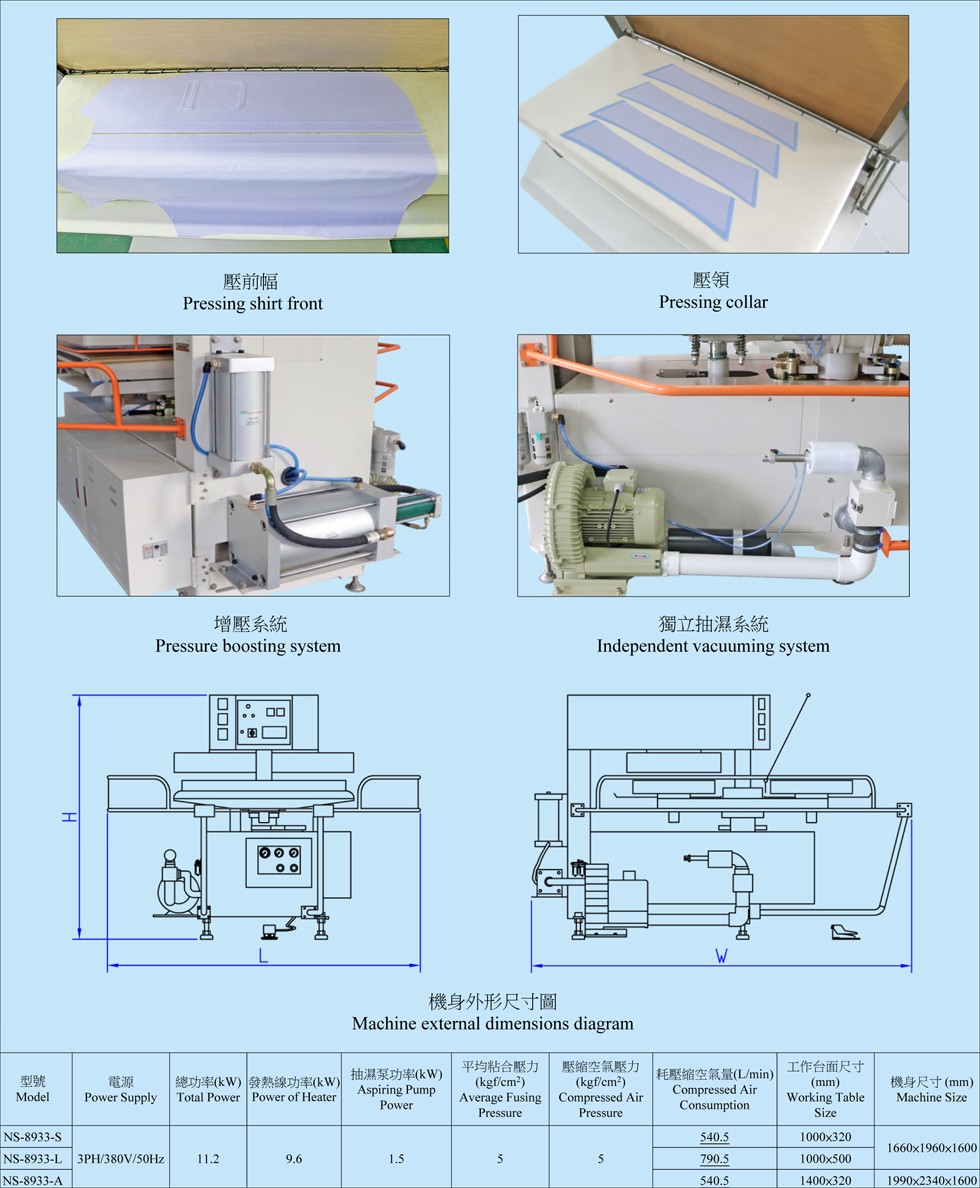 1.適用于襯衫前幅鈕子、鈕筒、領等粘合壓熨