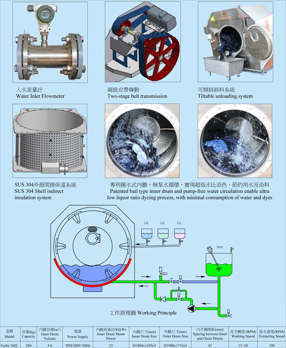 3.專利撥水式內(nèi)膽,無(wú)泵水循環(huán),實(shí)現(xiàn)超低水比染色,節(jié)約用水及染料