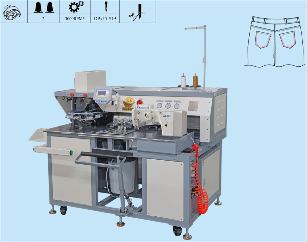 適用于牛仔面料口袋、斜紋面料口袋免燙貼袋,可自動折迭口袋,然后自動縫制