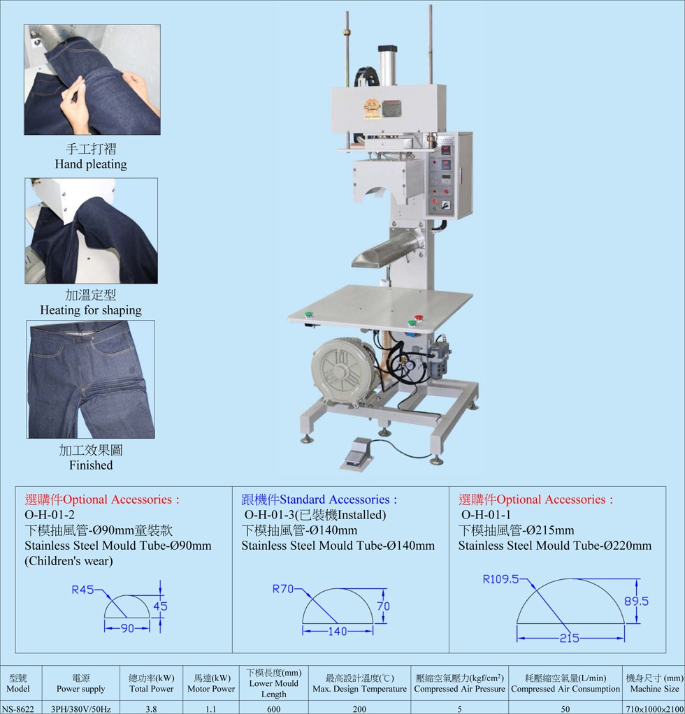 4. 上下模備有發(fā)熱線,可對布進行吹熱風(fēng)及加溫定型,褶皺效果更佳