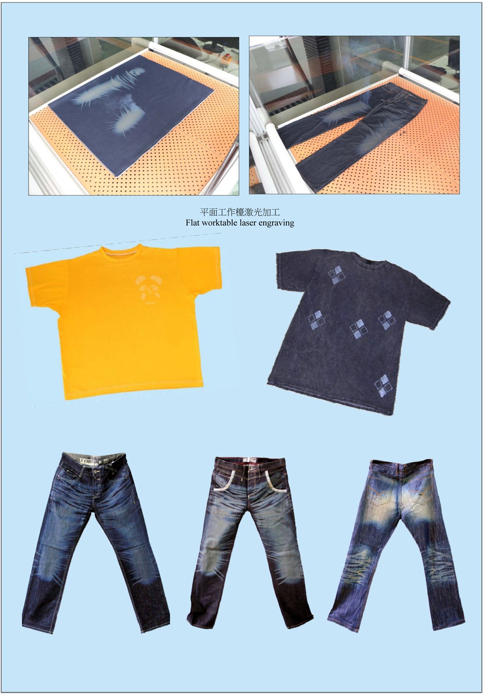 1. 激光機主要功能是代替人手在牛仔褲上做貓須、砂位、吊磨、破洞等效果。激光處理后,可根據(jù)需要配合局部PP噴涂、洗水濕處理等達到更完美效果