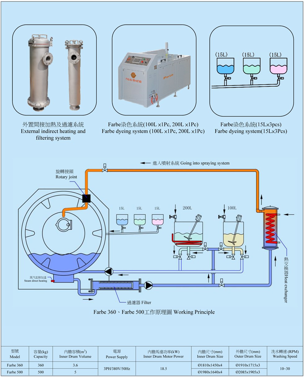 2. 前置機(jī)型,采用低水比(1:6~8)洗衣染色,配合循環(huán)噴水染色系統(tǒng),降低染色和洗衣成本