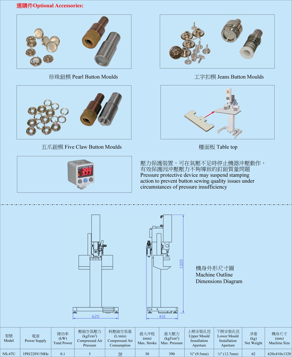 1. 適用于沖壓衣物上或真皮、塑料布料上的鐵鈕、膠鈕、珍珠鈕、工字扣等鈕扣