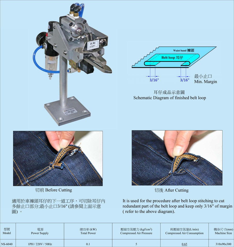 1. 適用于車褲頭耳仔的下一道工序,可切除耳仔內(nèi)多余止口部分