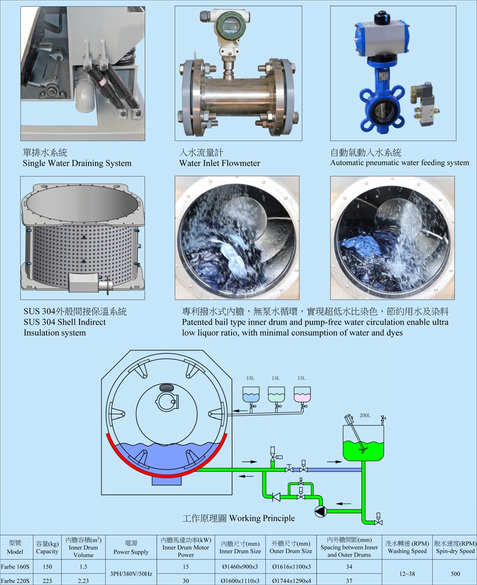 3.專利撥水式內(nèi)膽,無泵水循環(huán),實現(xiàn)超低水比染色,節(jié)約用水及染料
